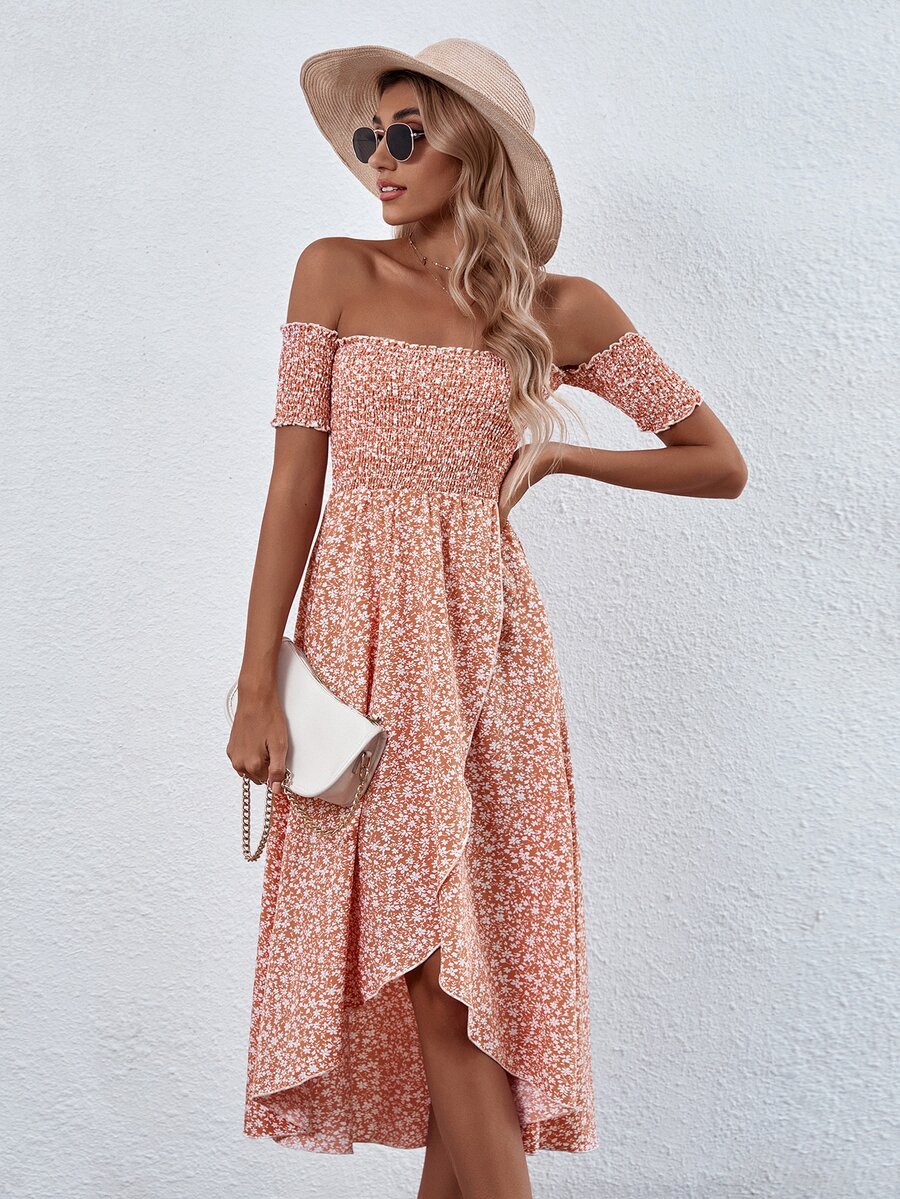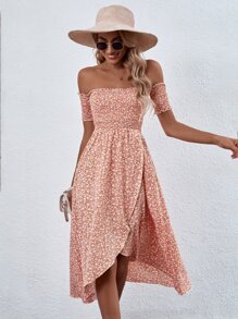 Ditsy Floral Off Shoulder Shirred Bodice Wrap Dress