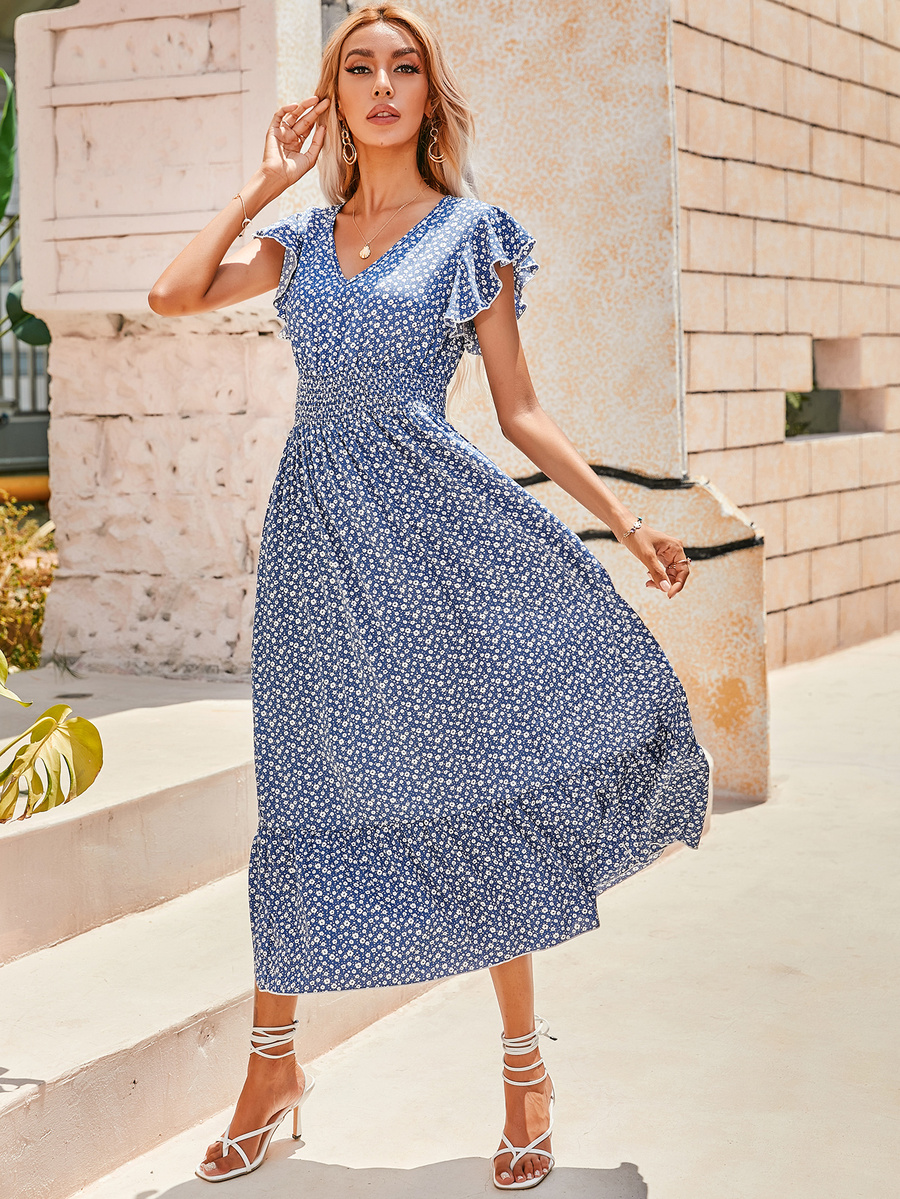 Ditsy Floral Shirred Waist Butterfly Sleeve A-line Dress