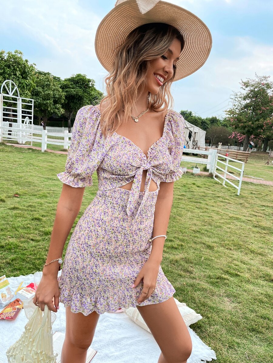 Ditsy Floral Tie Front Cutout Ruffle Hem Dress