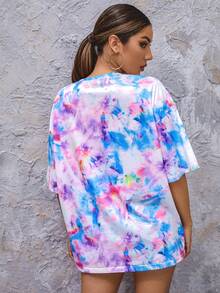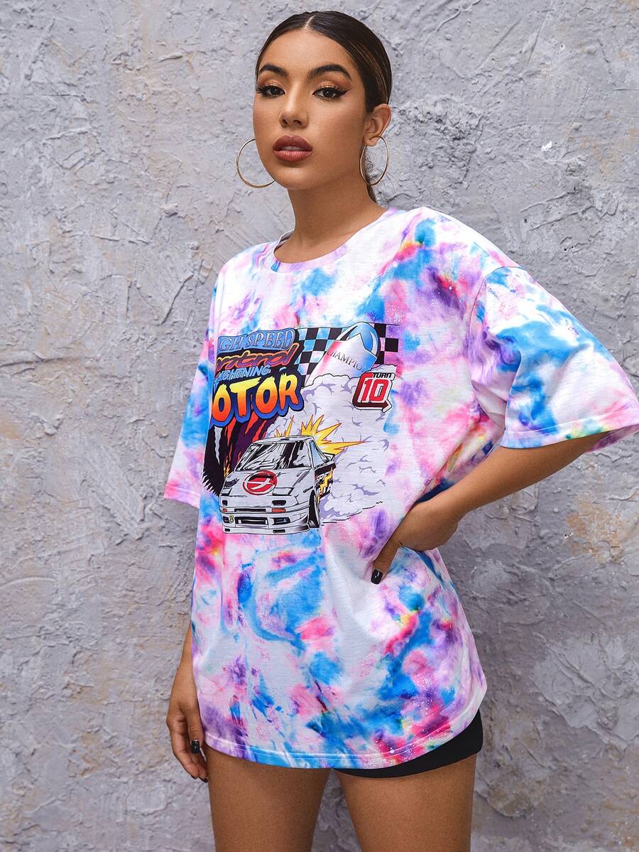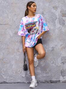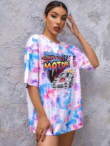 Bikercore Drop Shoulder Car & Letter Graphic Tie Dye Tee