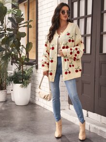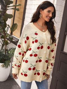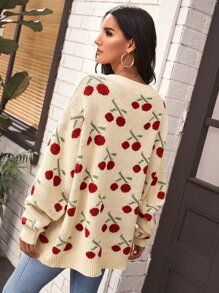 Drop Shoulder Cherry Pattern Cardigan