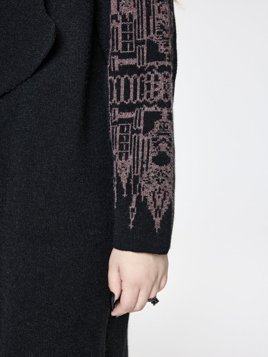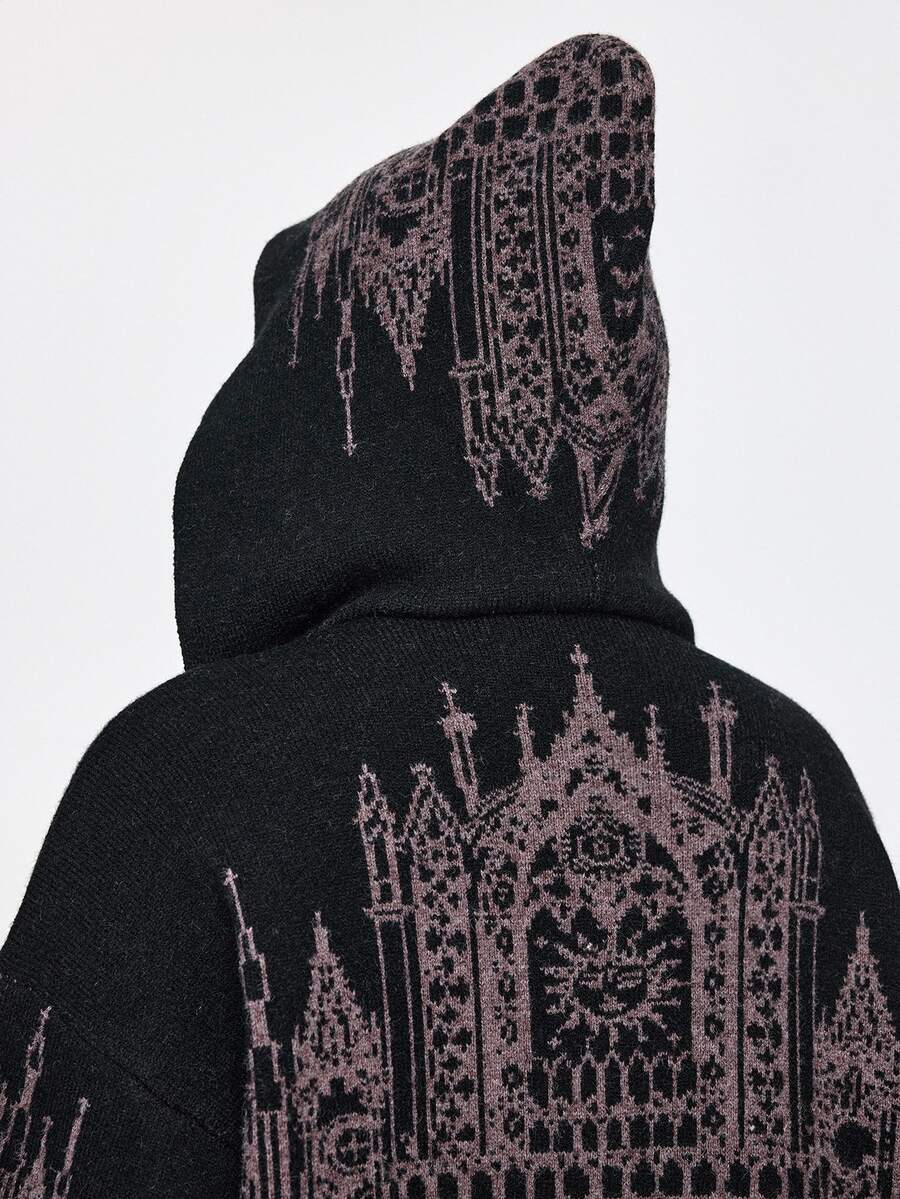 EDITION Dark Gothic Palace Print Fringe Trim Plus Size Hooded Cardigan