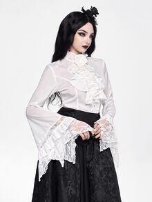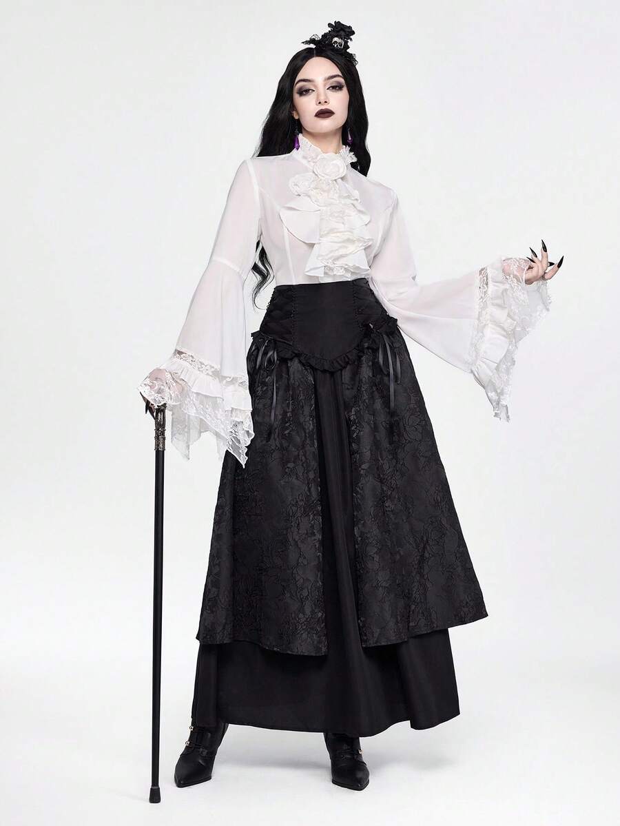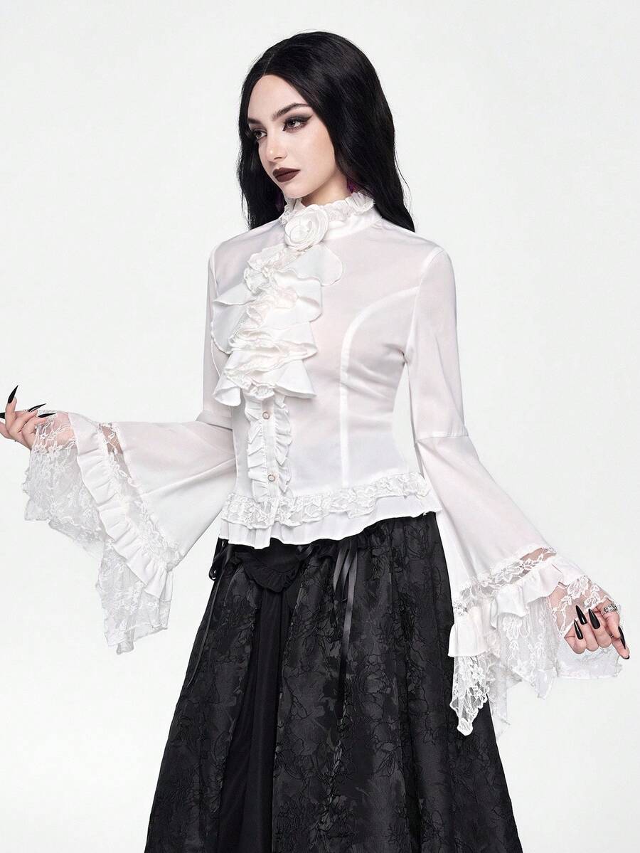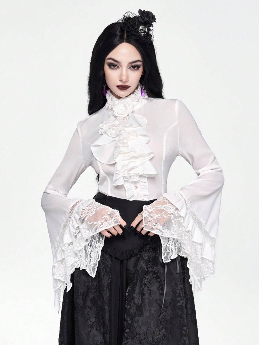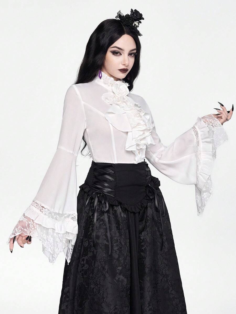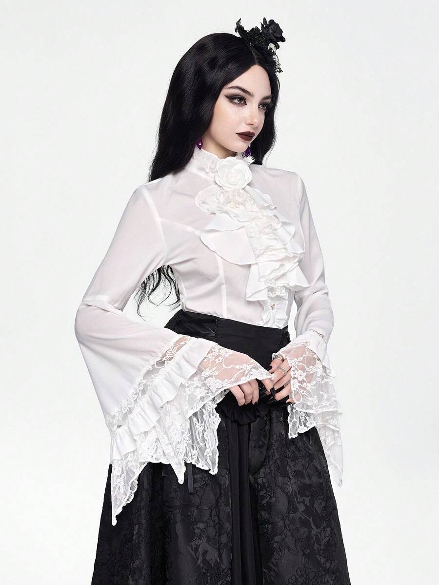 EDITION Gothic Dark Style Lace Bell Sleeve Hem Women Blouse, Suitable For Halloween