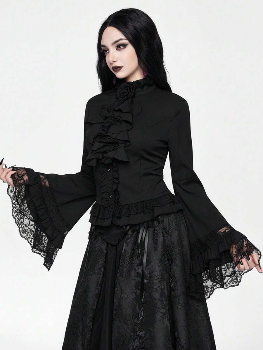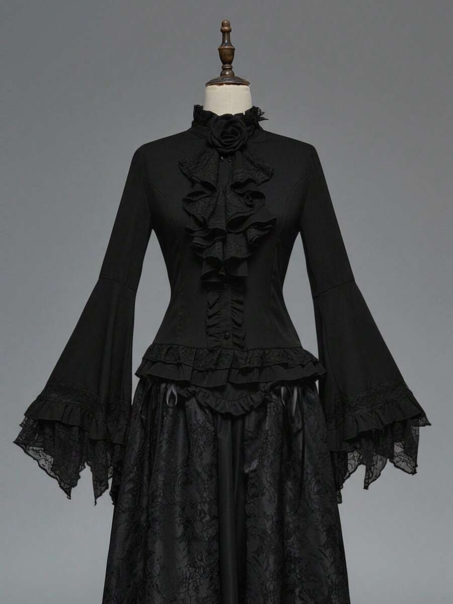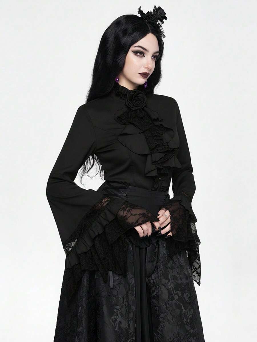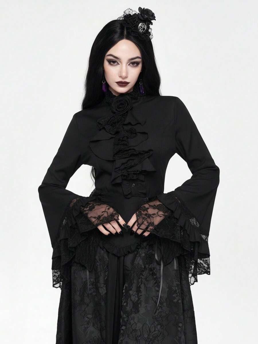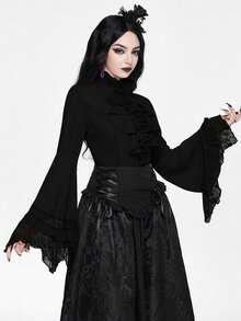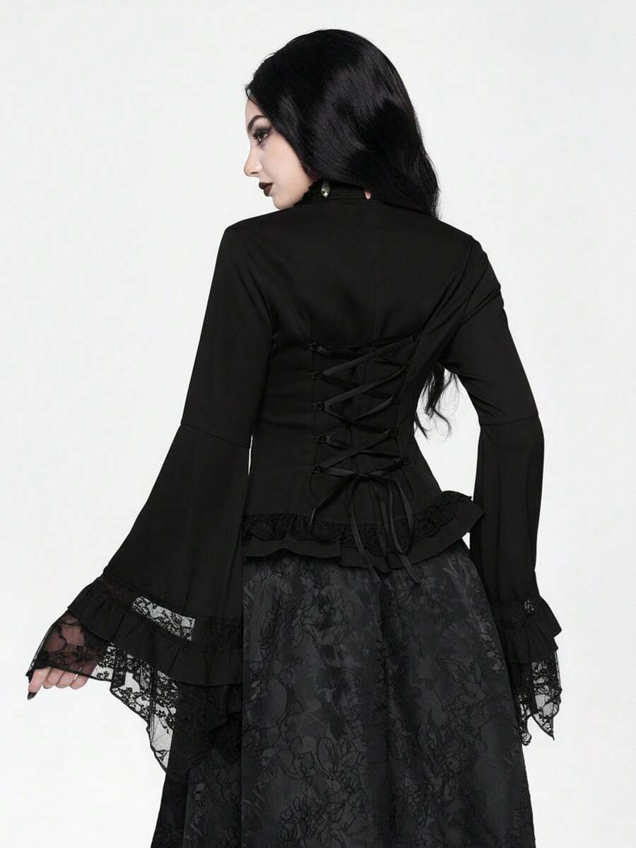 EDITION Gothic Style Lace Flare Sleeve Hem Women's Blouse, Suitable For Halloween Outfit