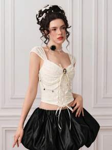 EDITION Women's Elegant Keyhole Collar Faux Pearl Chain Decor Ruched Tie Crop Top, Summer
