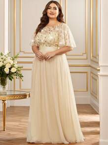 EVERPRETTY Plus Elegant Sequin Bodice Mesh Champagne Prom Dress Evening Dress For Party Bridesmaid Dress Fall Winter Wedding Guest Dresses