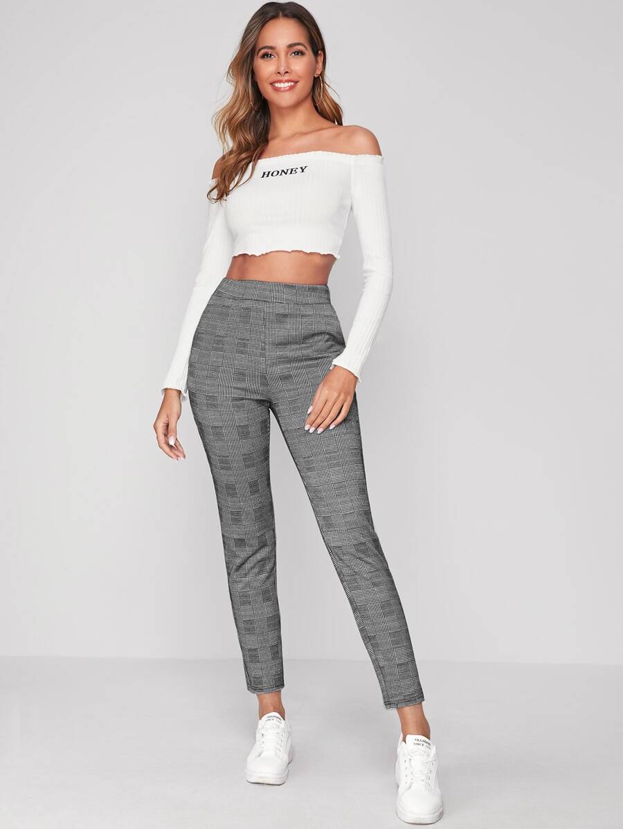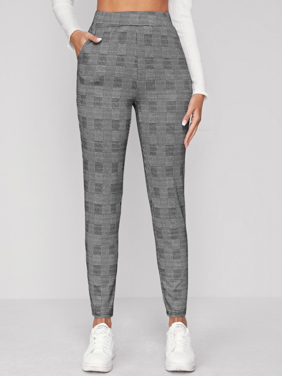 Elastic Waist Slant Pocket Plaid Pants Workwear