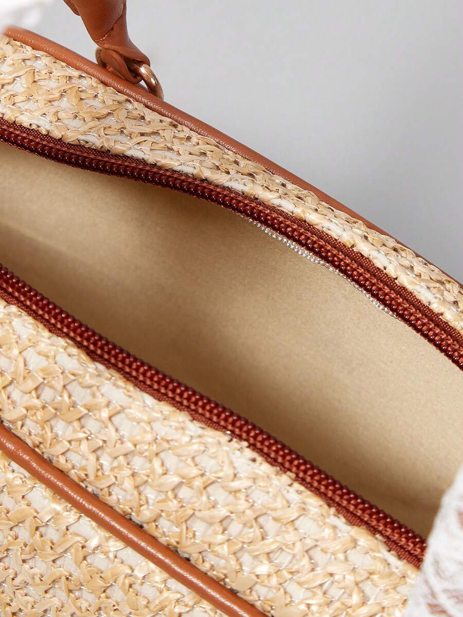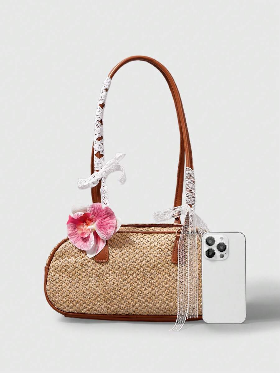 Fairycore 1 Set Floral Woven Beach Tote Bag And Accessories, Fashionable Personalized Beach Resort Style Women Shoulder Bag (Includes 1 Bag And 1 Set Of Accessories)