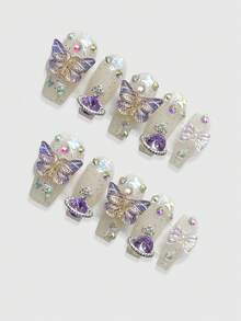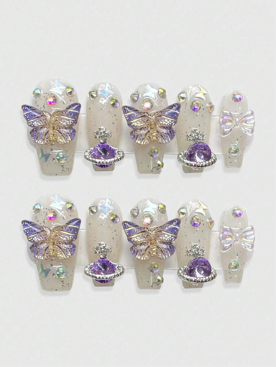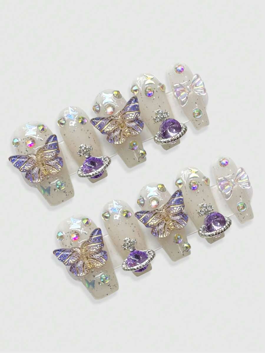 Fairycore 10pcs Long Coffin Butterfly & Rhinestone Decor Glitter Fake Nail Kit