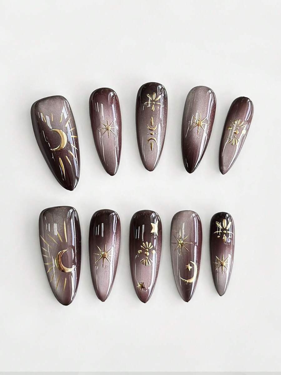 Fairycore 10pcs Sun, Moon & Star Handcraft Press-On Nails + 3pcs Double-Sided Adhesive Tape, Removable Gradient Color Painted Nail Art Decals, High Quality Glossy Cat Eye Colored Manicure, Suitable For Holiday Party, Dance And Daily Wear