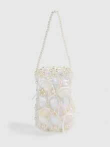 Fairycore 1pc Adorable Mini Faux Pearl Shell Bow Decor Seaside Wedding White Clutch Bag Bridal Beach Vacation Accessory For Bride