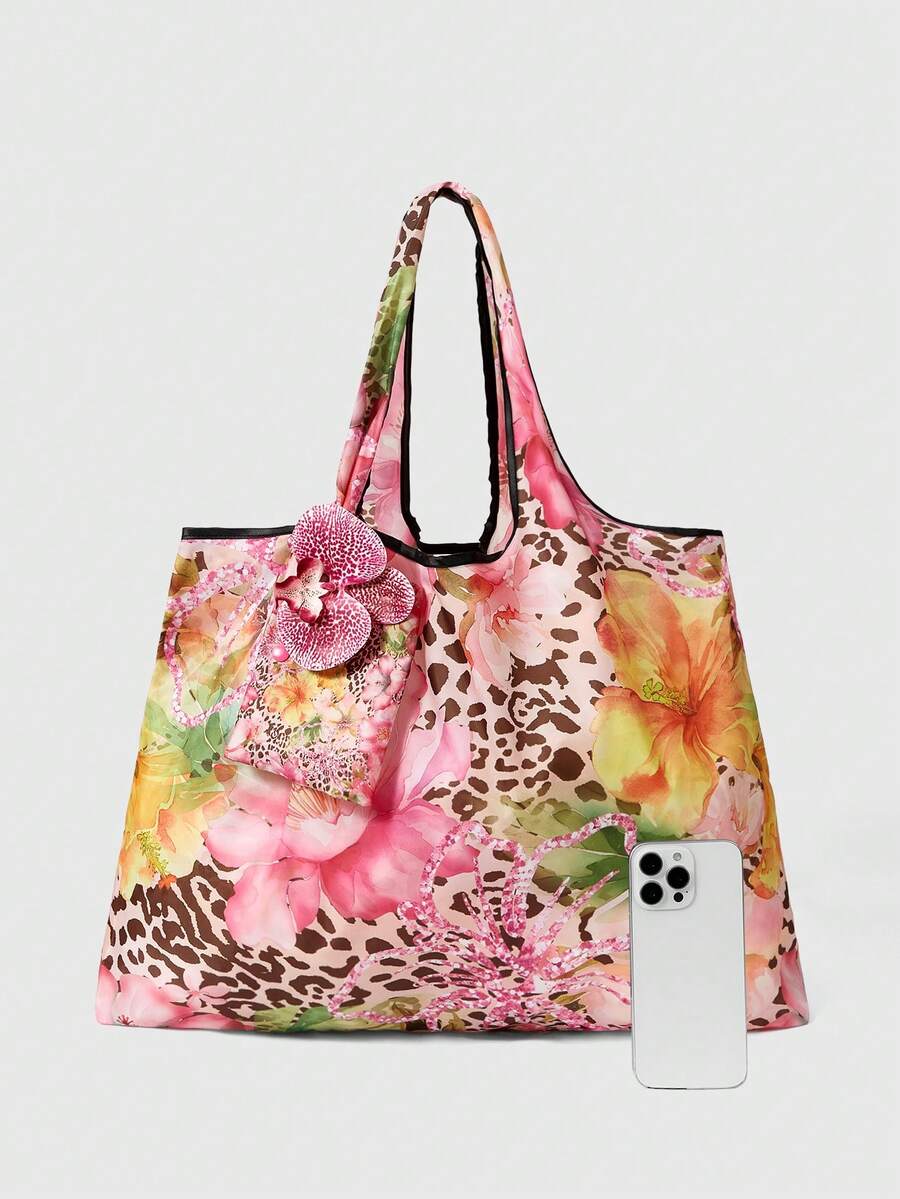 Fairycore 1pc Leopard Print Orchid Foldable Large Capacity Waterproof Shopping Bag, Suitable For Camping, Travel, Shopping, Back To School And Other Occasions