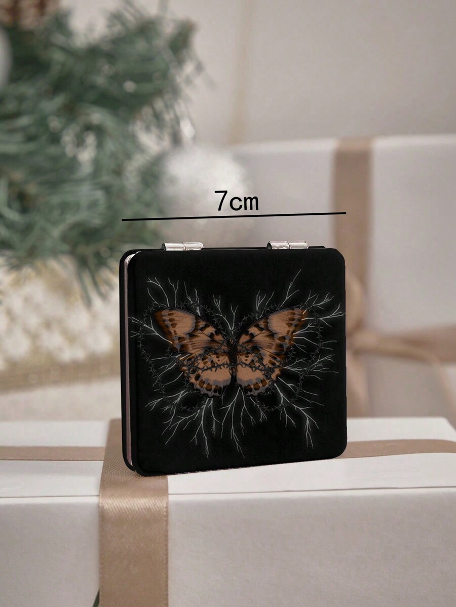 Fairycore 1pc Thorn Butterfly Print Black Square PU Makeup Mirror, Portable Handheld Mirror For Girls, Suitable For Home, Travel, Outdoor Use (Floral Pattern Placement Random)