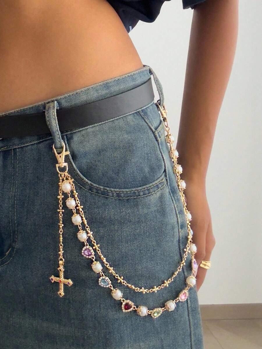 Fairycore 1pc Vintage Luxury Rhinestone & Faux Pearl Waist Chain, Women's Personalized Cross Chain For Pants Decoration