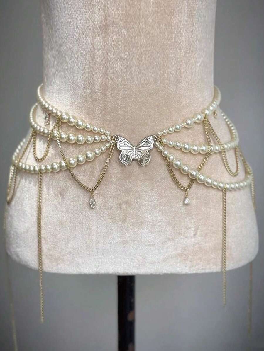 Fairycore 1pc Women's Chic Multi-Layer Pearl Beaded Butterfly Tassel Waist Chain