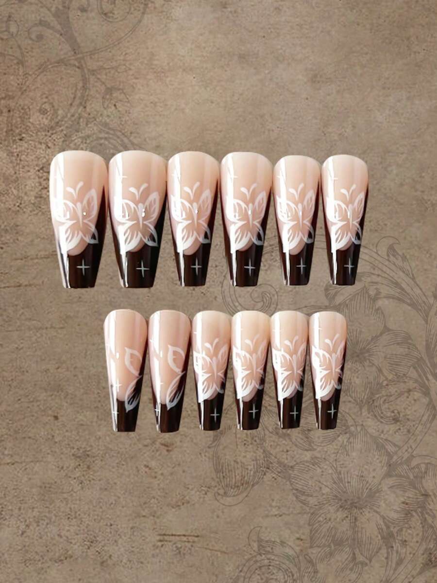 Fairycore 24pcs Long Coffin Butterfly Pattern Colorblock Fake Nail Kit