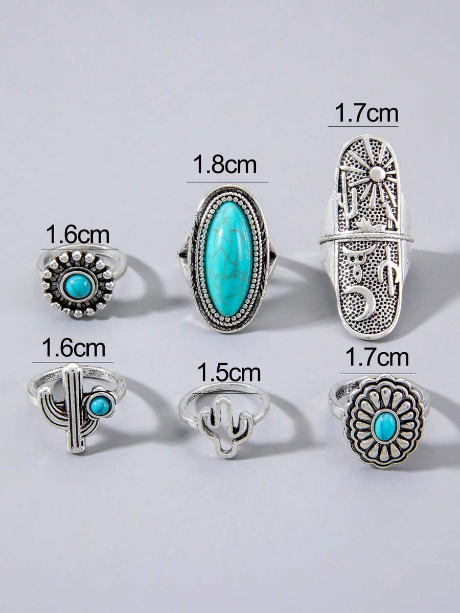 Fairycore 6pcs Boho Zinc Alloy Turquoise Decor Ring For Women For Daily Decoration