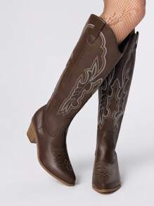 Fairycore Brown Western Style Embroidered Slip-On Knee High Boots, Women Fashion Leather Shoes For Spring Autumn