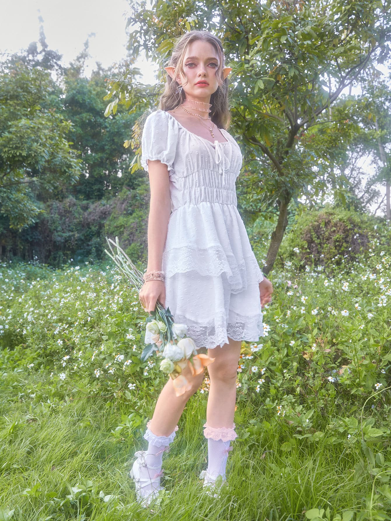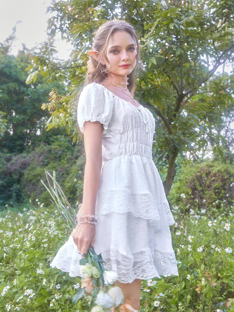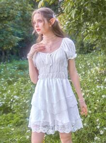 Fairycore Contrast Lace Ruched Bust Puff Sleeve Dress