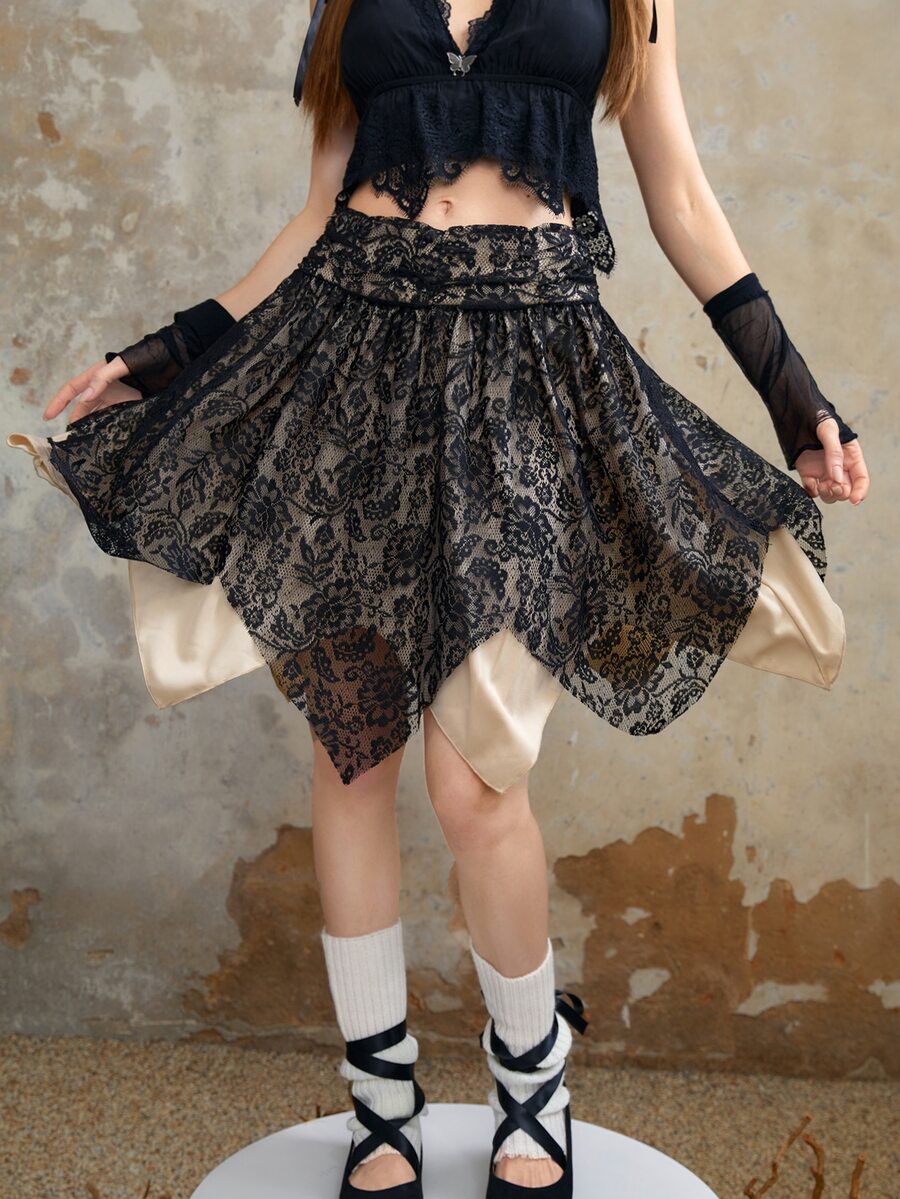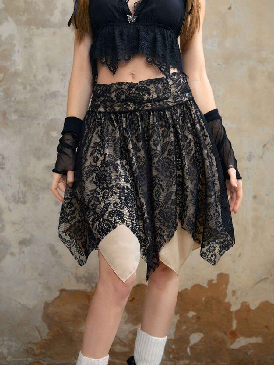 Fairycore Floral Lace Asymmetrical Hem Skirt