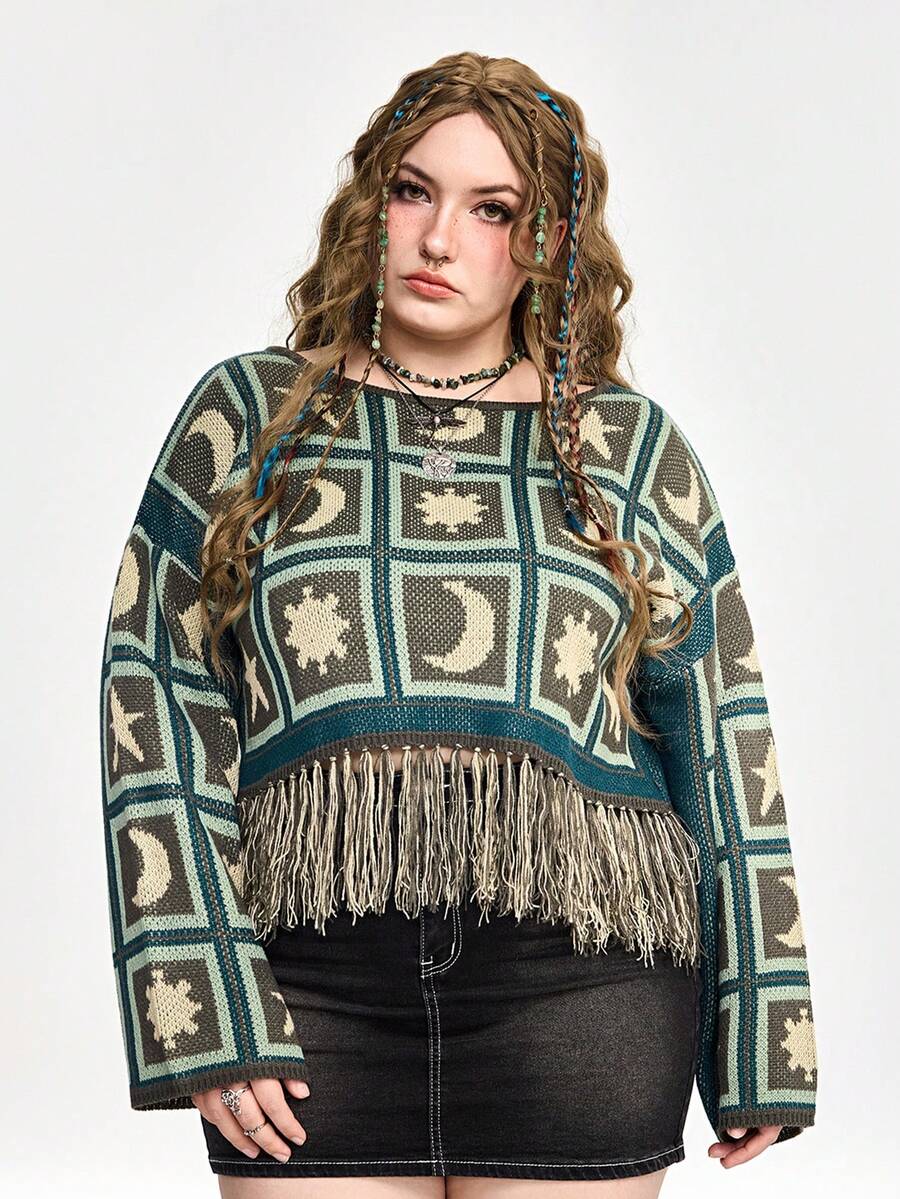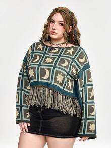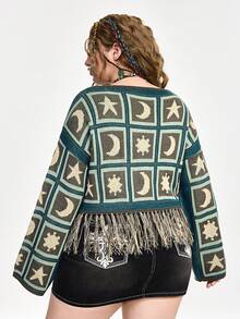 Fairycore Fairycore Geometric Moon & Star Crochet Fringe Hem Long Sleeve Plus Size Green Sweater, Plus Size Women Long Sleeve Pullover Sweater Tops For Autumn/Winter
