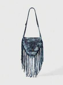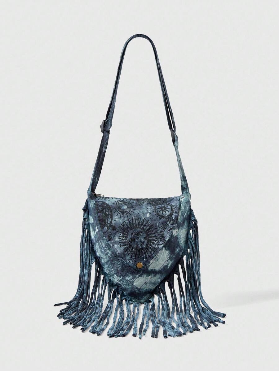 Fairycore Hippie Apocalypse Style Sun & Moon Print Tassel Crossbody Bag, Music Festival Hobo Bag, Handmade Random Pattern & Dye, Personalized Street Shoulder Bag
