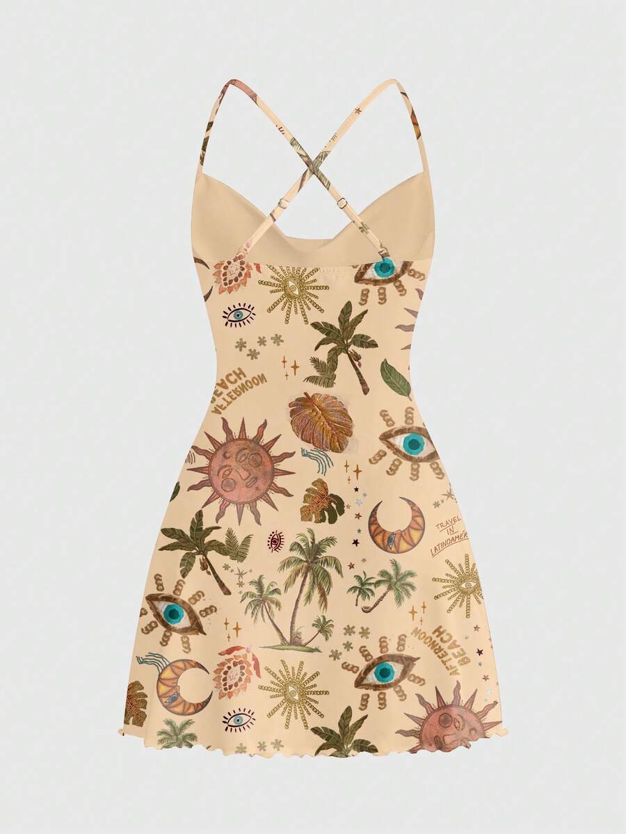Fairycore Low-Cut Plunging Neckline Sexy Sun Moon Star Hippie Mysterious Eye Print Vacation Dress For Women, Spring& Summer