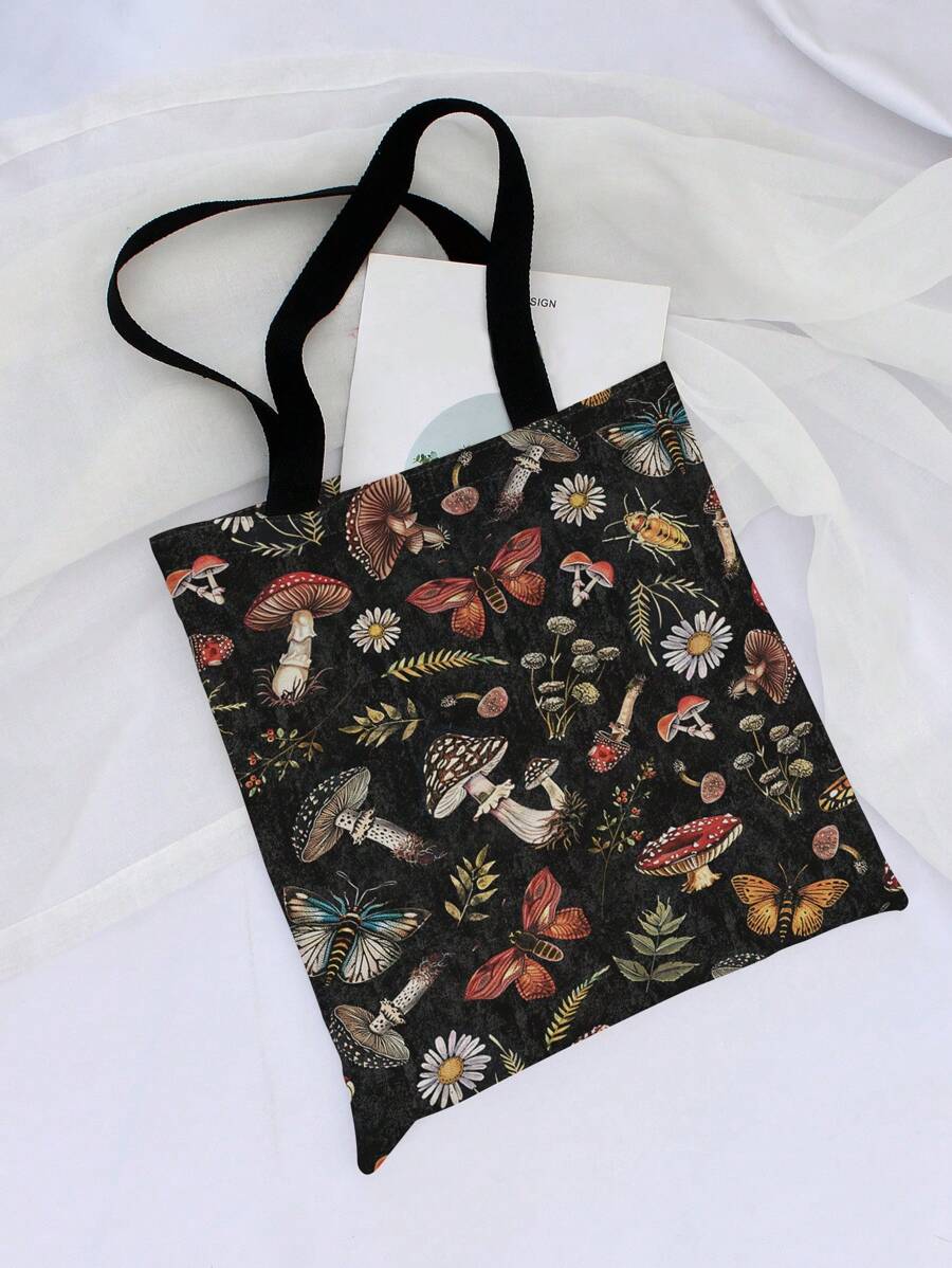 Fairycore Mushroom Butterfly Insect Pattern Double-Sided Printed Canvas Shoulder Bag, Butterfly Bag