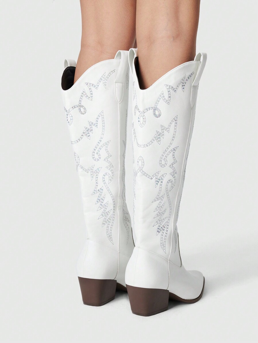 Fairycore Patterned Totem Embroidered Pointed Toe Low Heel Hippie Western Boots, Black PU Knee-High Cowgirl Boots For Everyday Wear