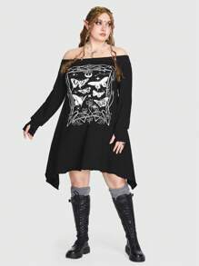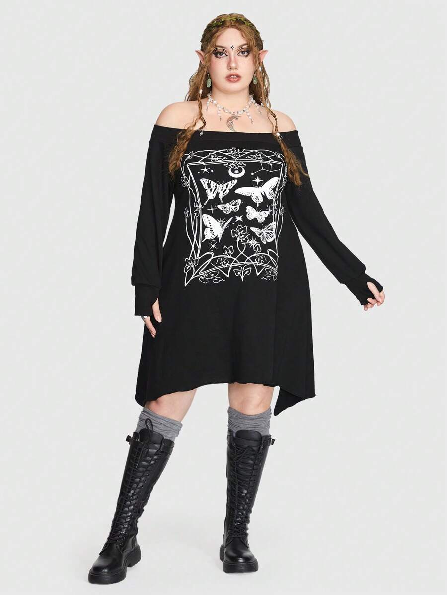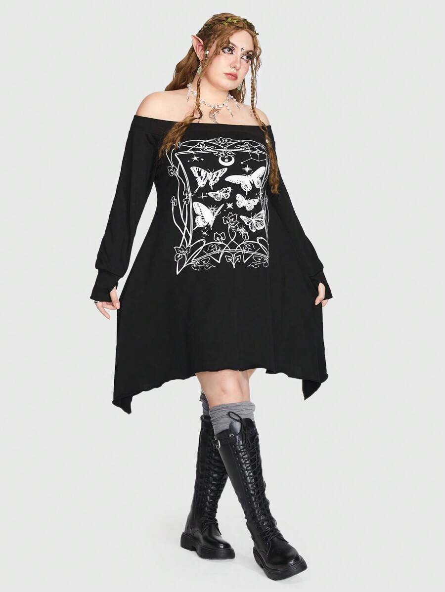 Fairycore Plus Butterfly Print Off Shoulder Asymmetrical Hem Dress