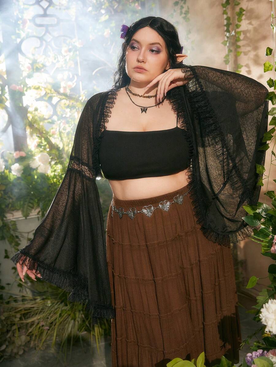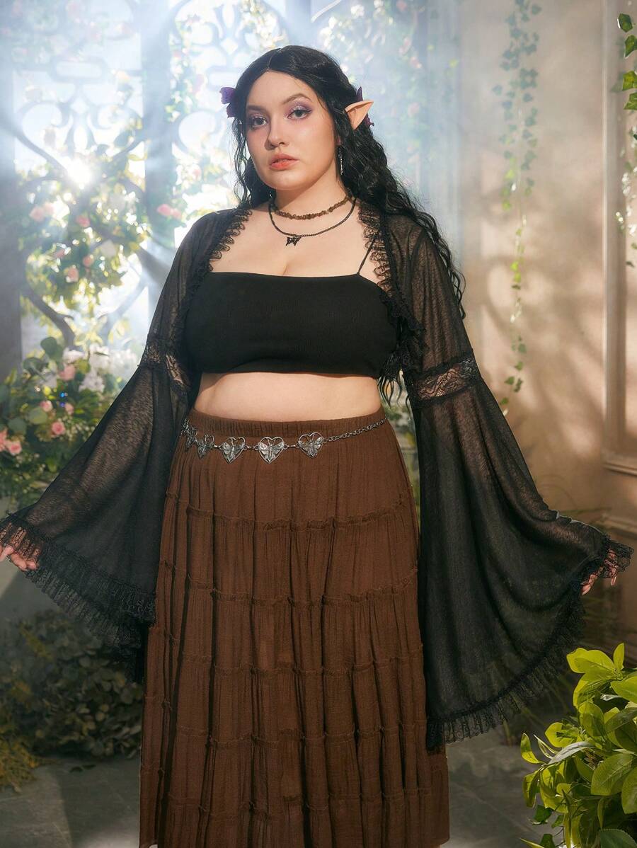 Fairycore Plus Contrast Lace Trumpet Sleeve Open Front Crop Top