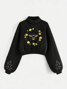 Fairycore Plus Size Women's Floral & Bee Embroidered Turtle Neck Sweater, School, For Winter