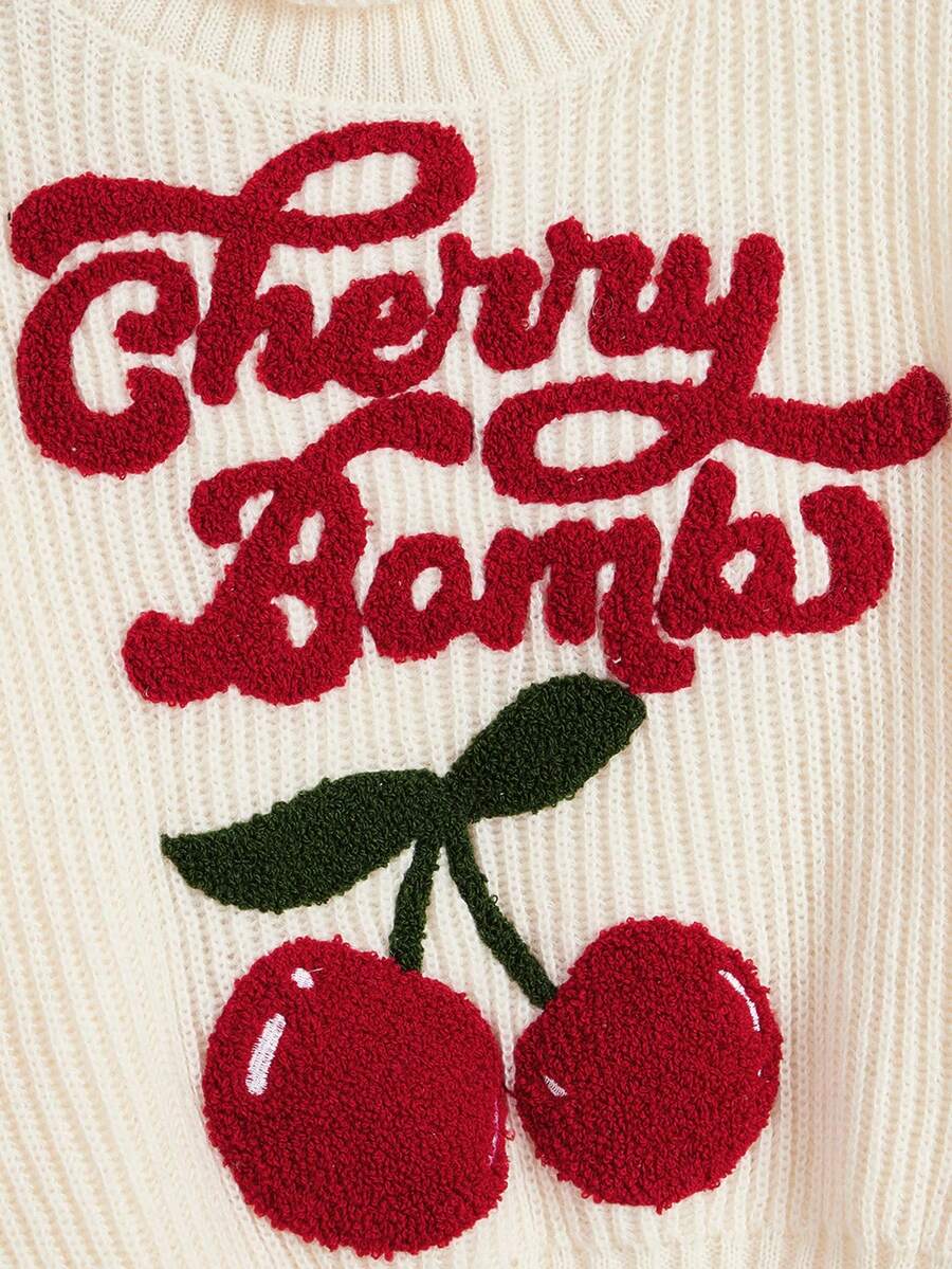 Fairycore Plus Size Women's High Neck Cherry Embroidered Logo Lantern Sleeve Knitted Pullover Sweater, Mori Girl Style, For Winter