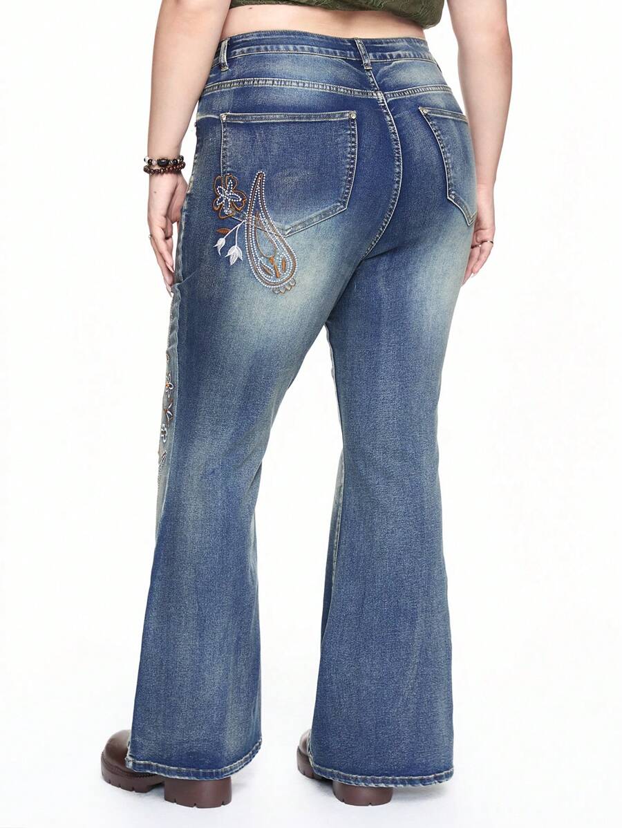 Fairycore Plus Size Women's Vintage Vine Embroidery Pearl Beaded Paisley Floral Print Flared Leg Jeans Pants