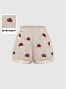 Fairycore Retro Cute Mushroom Embroidery Ruffle Hem Loose Plus Size Shorts