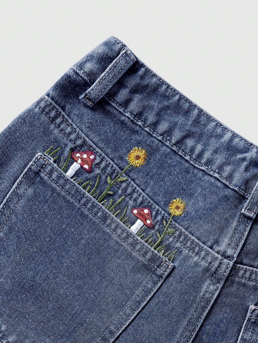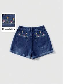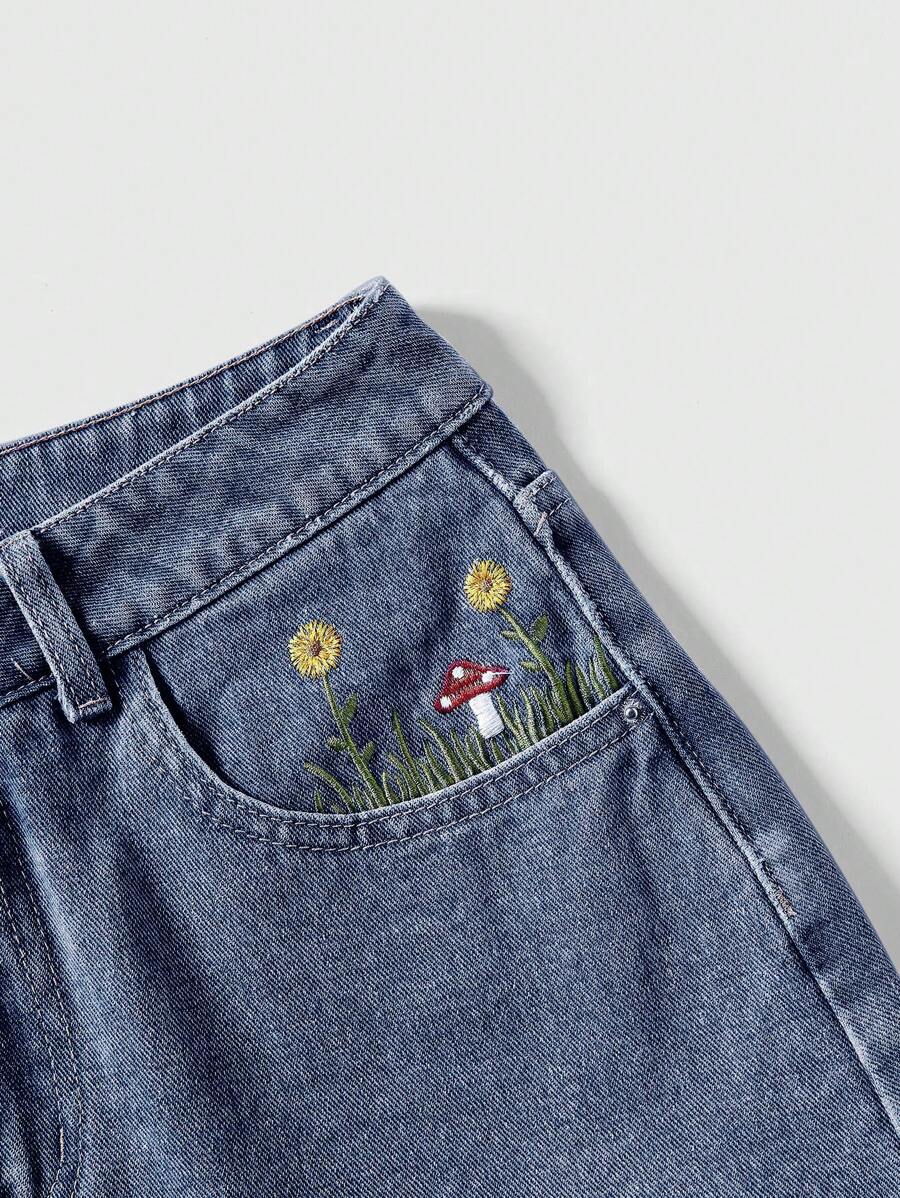 Fairycore Women's Casual Cute Sunflower Embroidery Denim A-Line Rolled Hem Shorts With Pockets