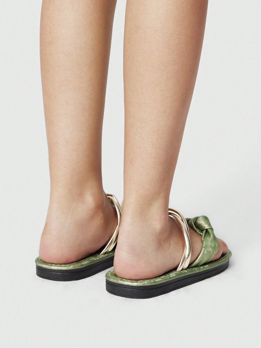 Fairycore Women's French Green Round Toe Flat Sandals, 2cm Outdoor Toe-Covering Pearl Bow Decor Design Green Floral Print PU Fashion Versatile Casual Beach Holiday Slides Spring Shoes