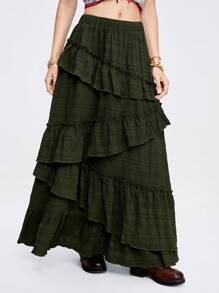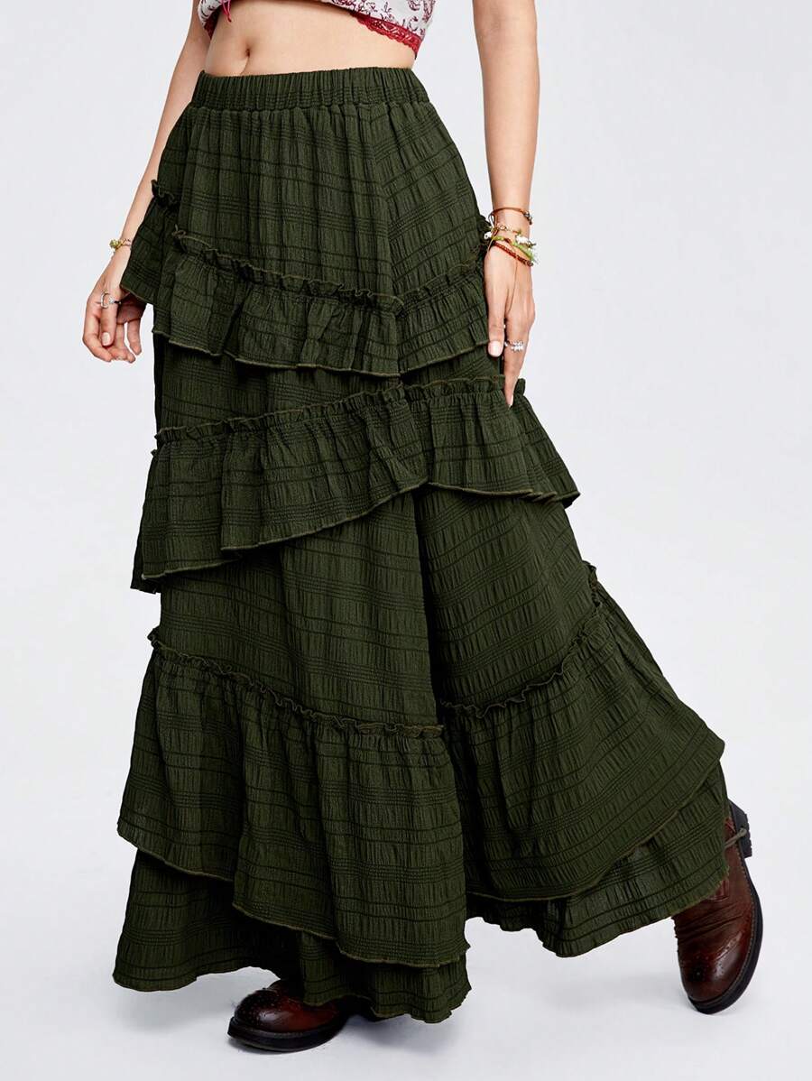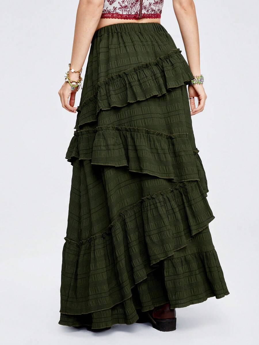 Fairycore Women's High Waisted Flowy Skirt, Green Military Texture Fabric With Ruffle Hem