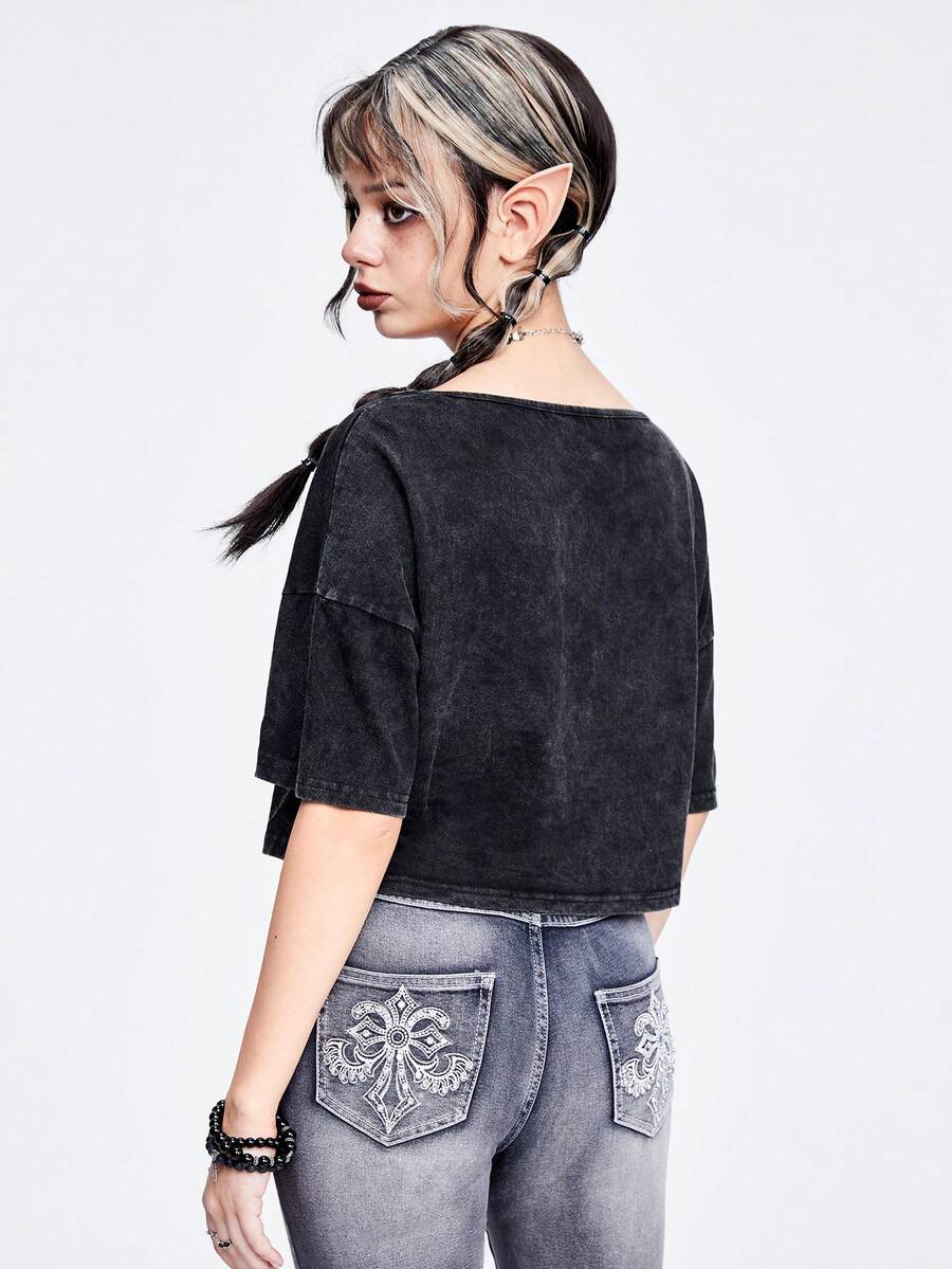Fairycore Women's Loose Cropped Snow Wash T-Shirt With Vintage Lily, Thorn And Rhinestone Embellishments