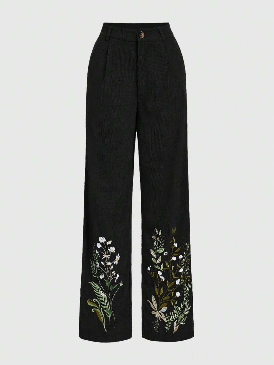 Fairycore Women's Pleated Wide Leg Loose Casual Green Plant Embroidered Pants