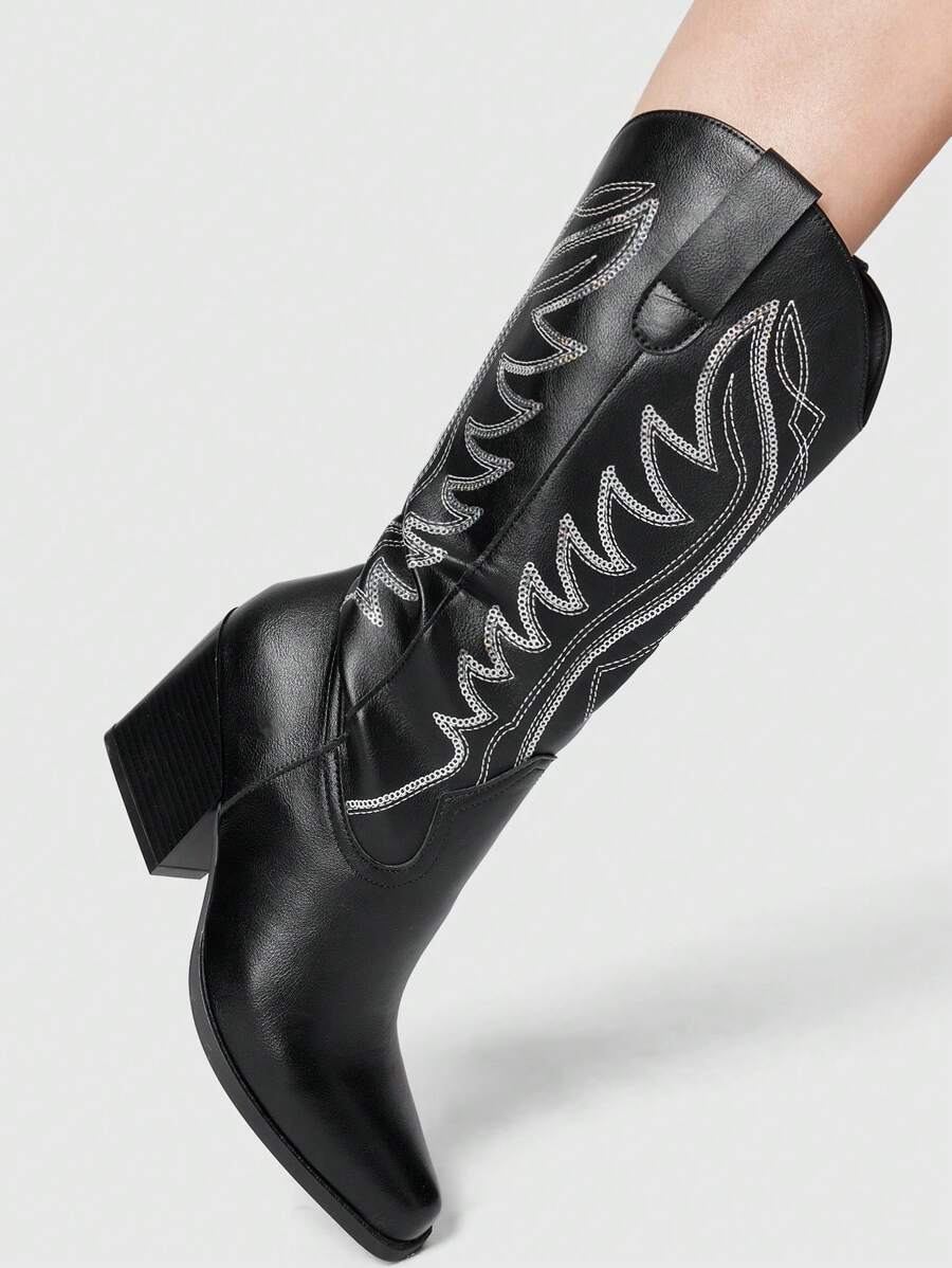 Fairycore Women's Pointed Toe Chunky High Heel Elegant Embroidered Western Cowboy Boots, Slip-On Leather Mid-Calf Cowgirl Boots, New Fashion Spring/Autumn