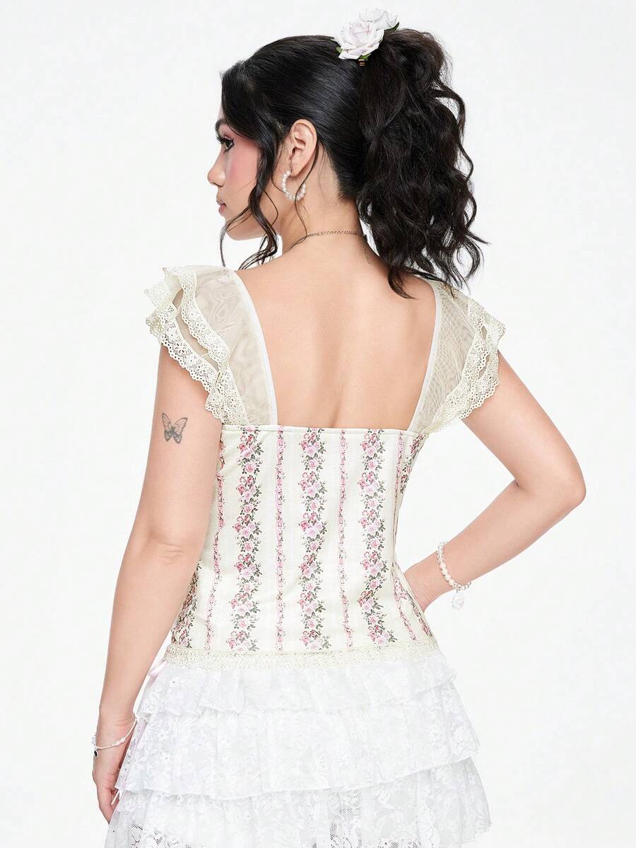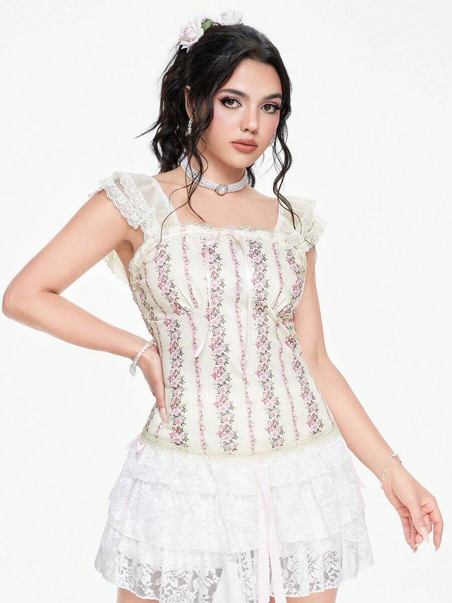 Fairycore Women's Renaissance Court Vintage Lace Trim Bow Knit Slim Fit Top With Silk Ribbon