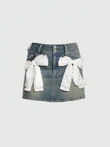 Fairycore Women's Summer Fashion Denim Skirt Decorated With Rhinestone Bowknot