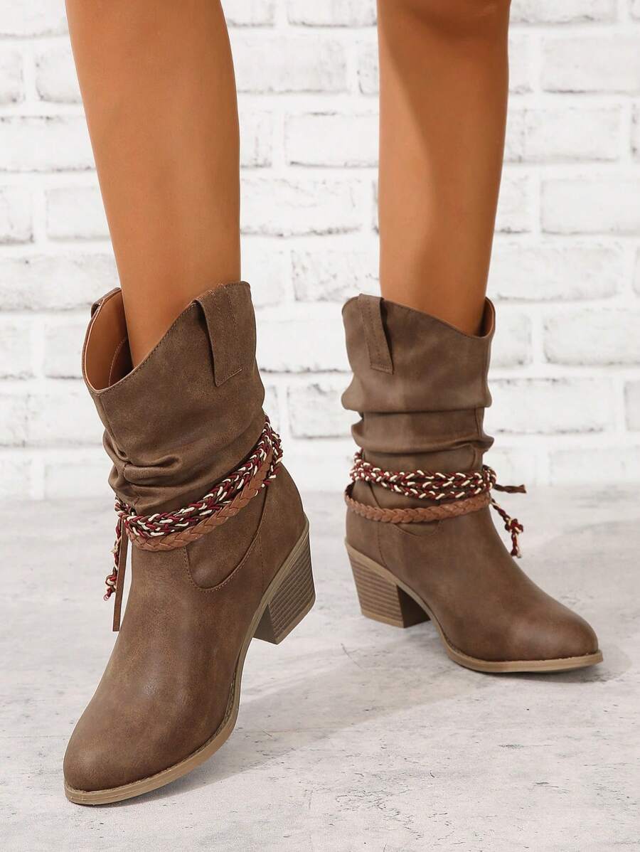 Fairycore Fall/Winter Brown Knee High Fringed & Braided & Buckled High Heeled Fashion Boots For Women,Western Style,Cowboy Boots