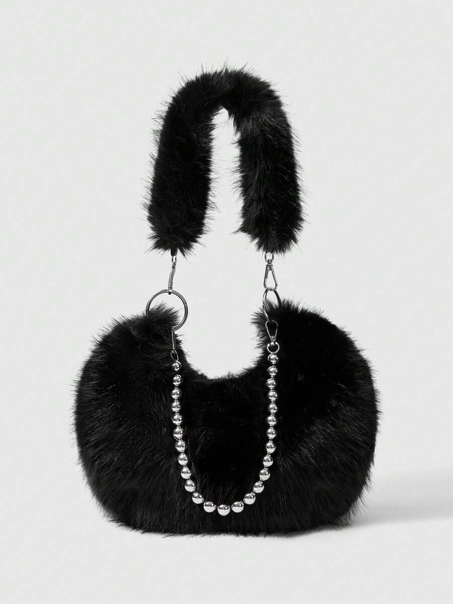 Grunge Punk Fashionable Faux Fur Handheld Chain Shoulder Solid Color Women's Bag