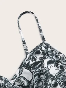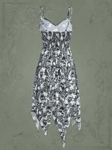 Goth Floral & Skull Print Hanky Hem Cami Dress
