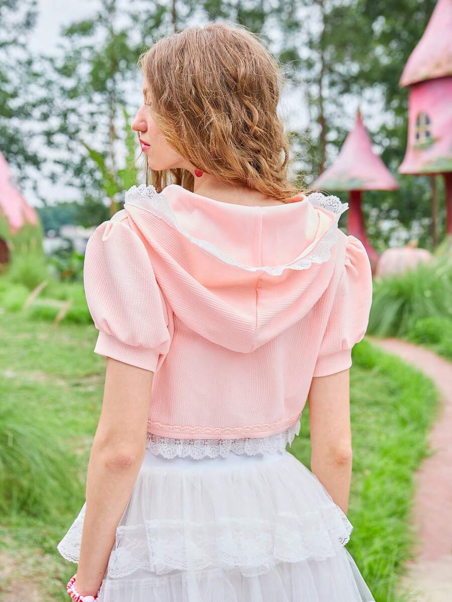 Kawaii Floral Appliques Contrast Lace Puff Sleeve Top