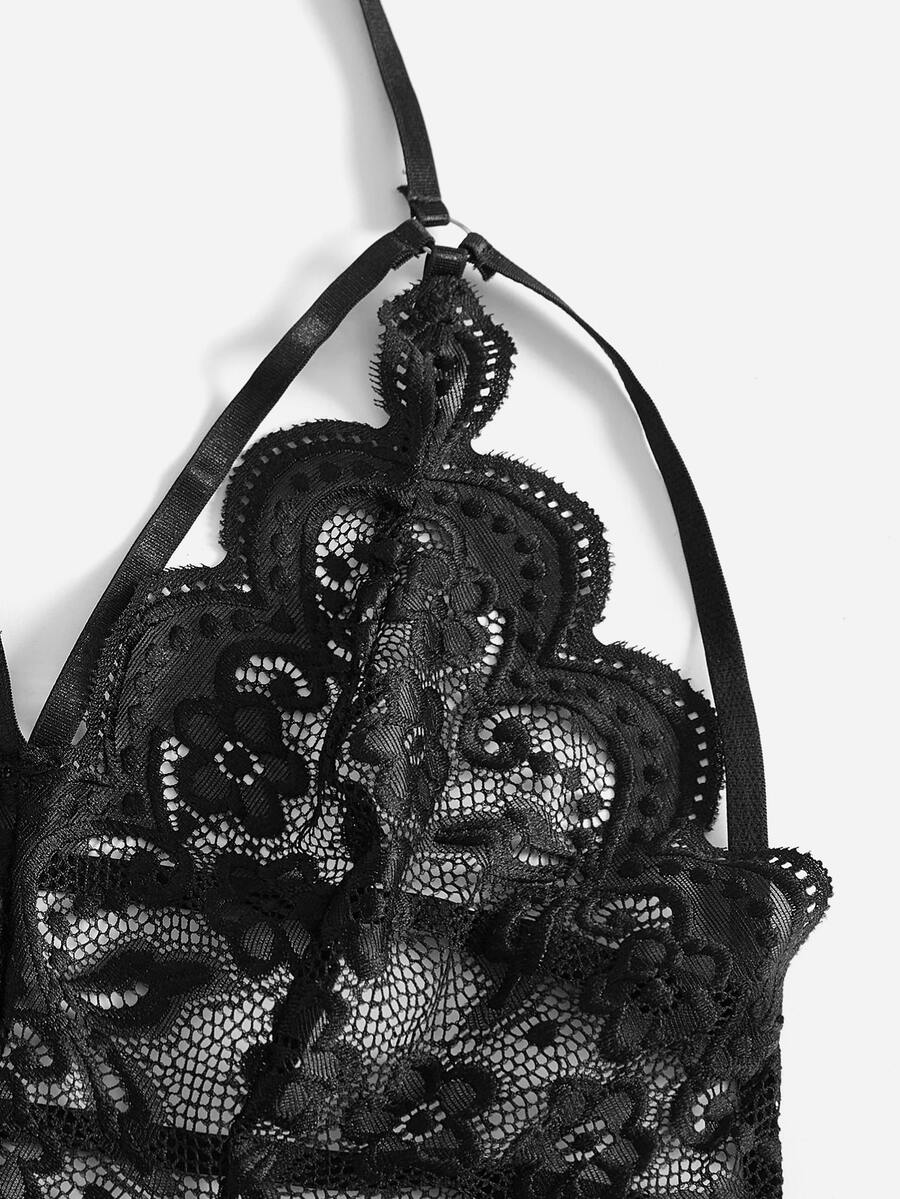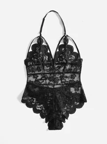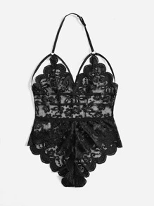 Floral Lace Scallop Trim Harness Teddy Bodysuit