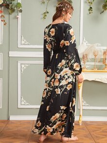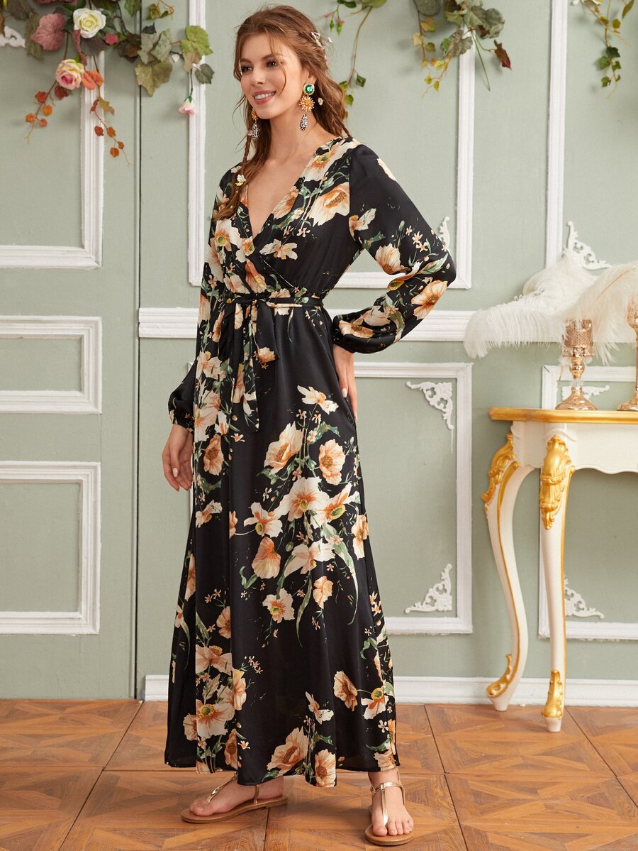 Floral Print Self Belted Balloon Sleeve Wrap Dress