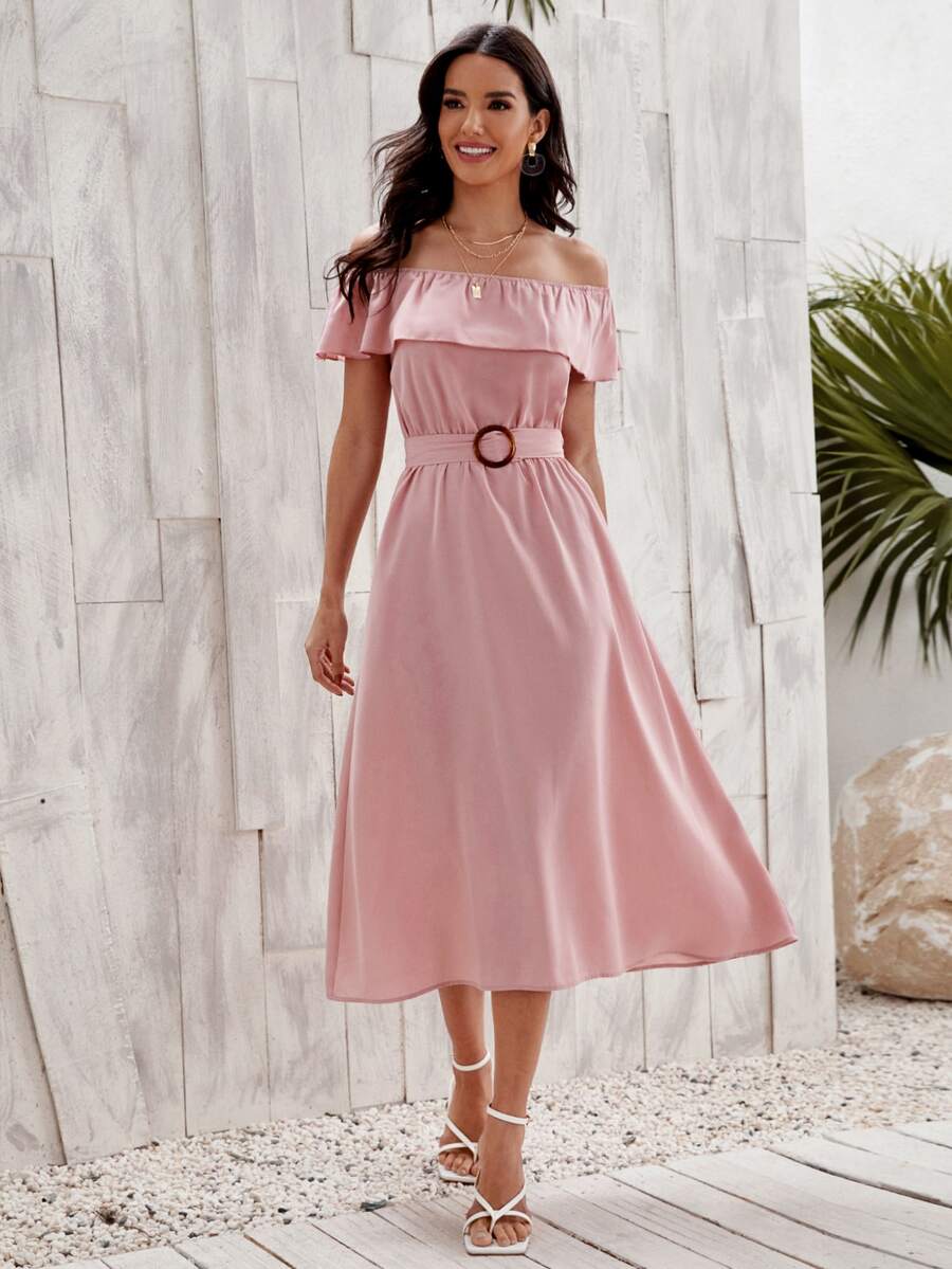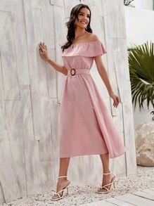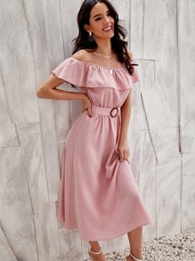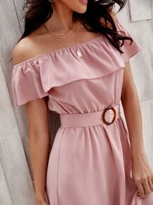Flounce Off Shoulder Self Buckle Belted Dress
